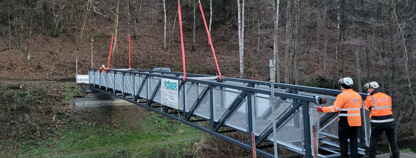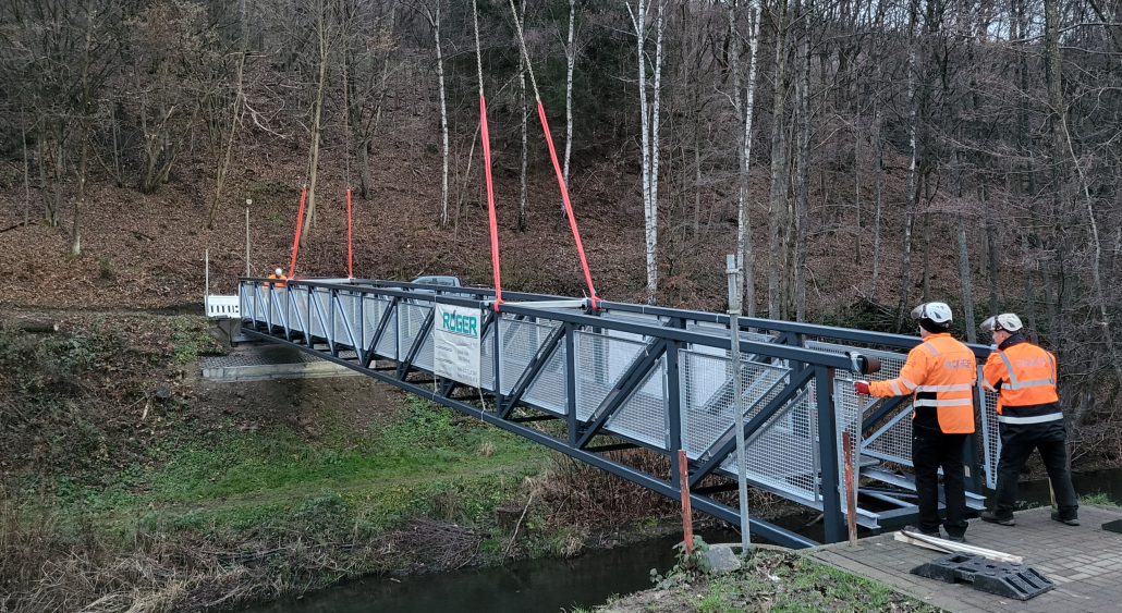 Die neue Brücke an der „Alten Hütte“ in Herdorf (Rheinland-Pfalz) ist freigegeben. Im Auftrag der Stadt Herdorf haben wir die Fußgängerbrücke gefertigt und montiert. Die knapp 11 Tonnen schwere Stahlkonstruktion überspannt den Fluss „Heller“. Sie ist über 28 Meter lang und 1,80 Meter breit. Die Brücke ist barrierefrei und bietet ausreichend Platz – zwei Personen können problemlos passieren, ebenso Rollstuhlfahrer. Fahrradfahrer werden von der Stadt gebeten, ihr Rad zu schieben.